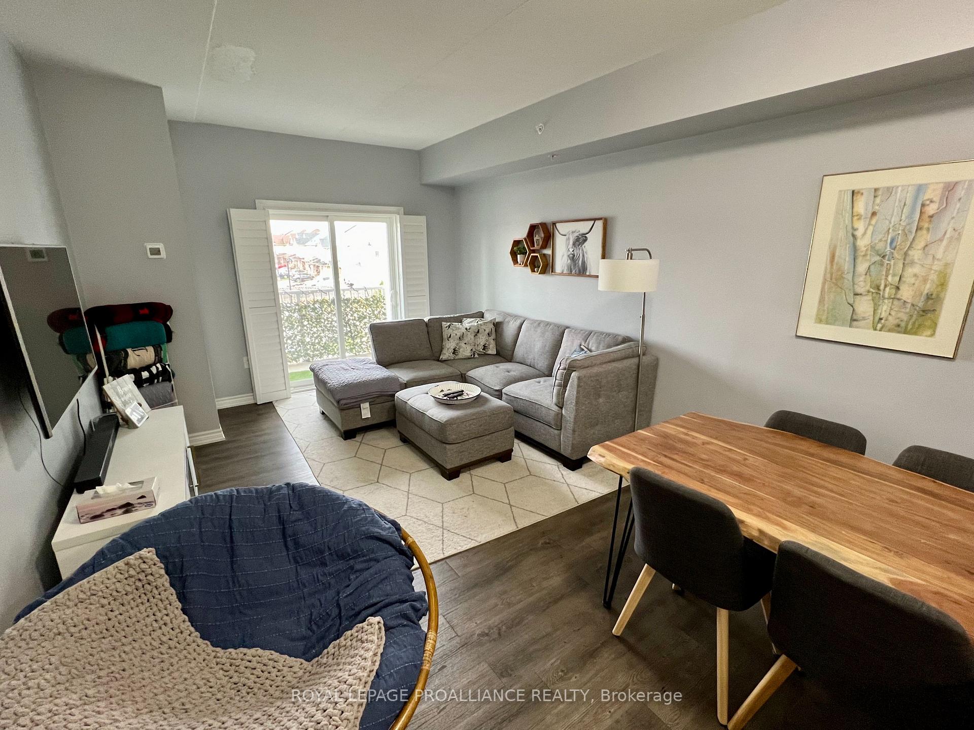 Welcome to the meticulously maintained Metropolitan unit at Madison Lane in Bowmanville! This bright and beautiful 976 sq. ft. suite offers open-concept living at its best. The stunning kitchen features modern cabinetry, quartz countertops, and a gleaming tile backsplash, complete with a generous storage closet just off the kitchen. The combined living and dining area provides the perfect space for relaxing or entertaining, with a walk-out to a private balcony. The spacious primary bedroom includes a large closet and a 4-piece ensuite finished with modern tile surround and a quartz countertop. The unit also has beautiful custom made California shutters throughout and sound deadening attachments on doors and room walls upgraded with sound proofing insulation. Two parking spots are also included.