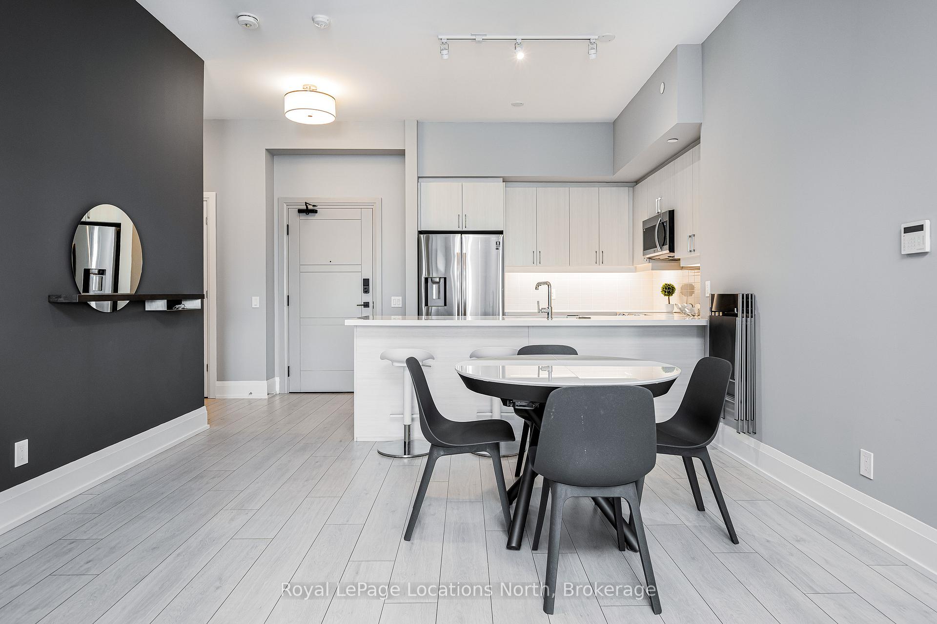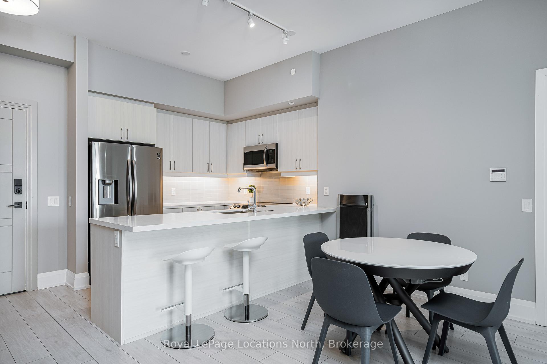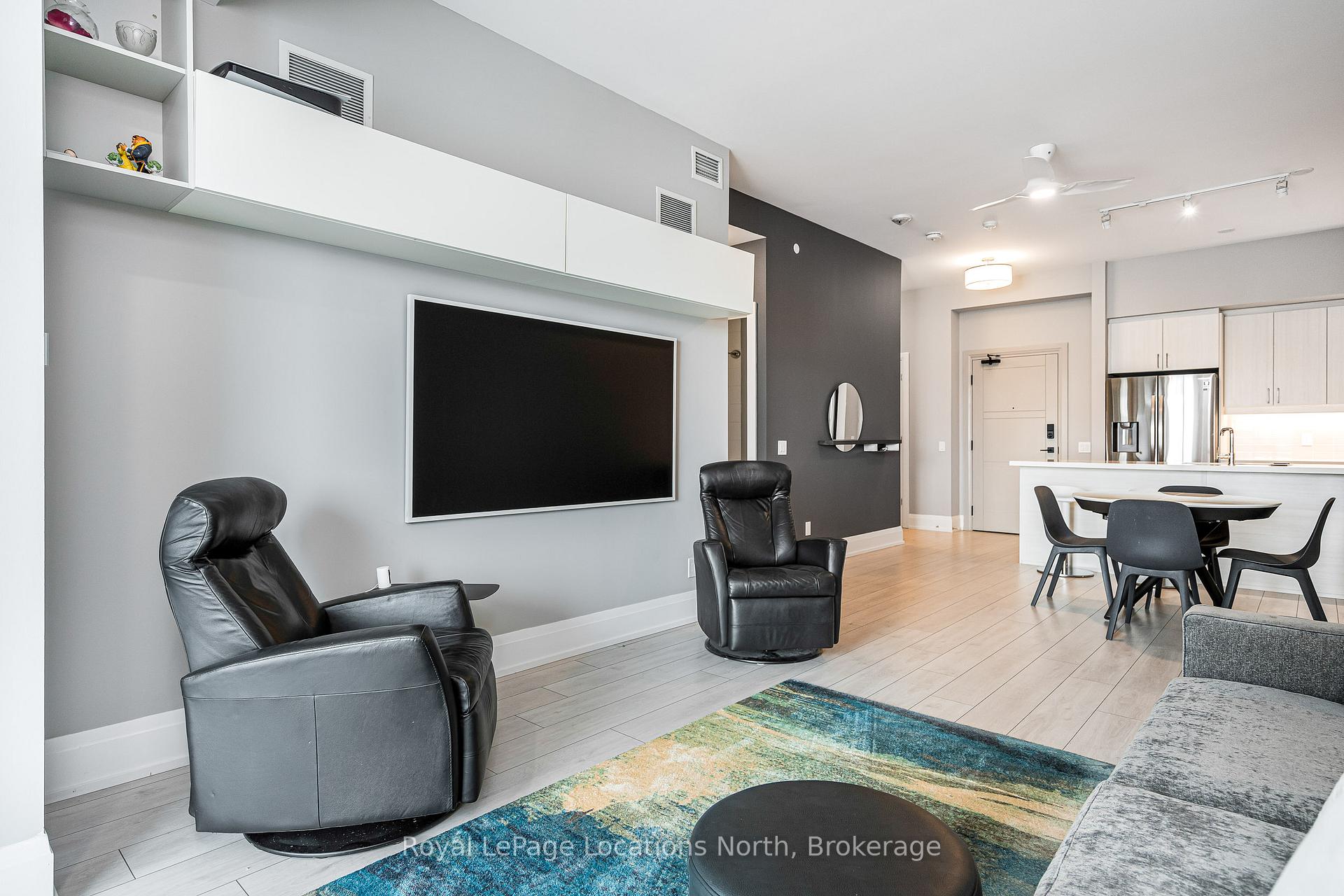 Experience refined living at Monaco, downtown Collingwood's most coveted address. This beautifully appointed "Beatrice" model offers 1,150 sq. ft. of thoughtfully designed space, featuring 10-foot ceilings and an open-concept layout filled with natural light. This particular unit stands out with its generous 226 sq. ft. private terrace spanning the full width of the condo, an incredible extension of your living space and the perfect spot for summer evenings, morning coffee, or entertaining friends. Inside, you'll find two spacious bedrooms plus a versatile flex space ideal for a home office or welcoming entry/mudroom. The primary suite offers a spa-inspired ensuite complete with a walk-in glass shower, double vanities and walk-in closets. The second bedroom is equipped with a built-in Murphy bed and enjoys access to its own private bathroom, perfect for guests. The kitchen is stylish and functional, featuring quartz countertops, ceramic tile backsplash, stainless steel appliances and a large island that connects to the living area, ideal for hosting and everyday living. Residents of Monaco enjoy exceptional amenities, including a stunning rooftop terrace with waterfall and fire pit, alfresco dining area with BBQs, an indoor social lounge with bar and a fitness centre overlooking Blue Mountain. Additional features include secure FOB entry, underground parking with two dedicated spaces, a large storage locker, Wi-Fi-enabled common areas and a pet-friendly atmosphere. With direct access to Collingwood's vibrant main street, you're just steps from restaurants, shops and the waterfront. The on-site upscale market and café add another layer of convenience and community. This is effortless luxury living in the heart of Collingwood where lifestyle truly meets location.
