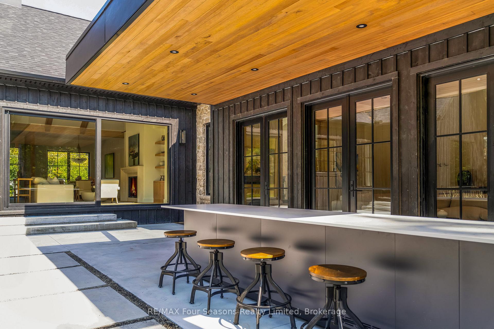 LUXURY DESIGN BUILD NEAR CRAIGLEITH / ALPINE: This custom-built masterpiece by Coastal Impressions blends timeless European architecture with modern luxury, offering 5589 finished sq ft (3546 AG + 2043 BG) on a beautifully landscaped 80 x 192 lot. The exterior showcases board and batten with hand-laid stonework reminiscent of old-world craftsmanship, while the interior features 8.5 engineered white oak flooring, soaring 10' / 12' ceilings with vaulted areas up to 18', & graceful barreled archways. The gourmet kitchen opens to a warm family room with a large gas fireplace + a separate dining area and is highlighted by a custom white oak island with quartz countertops, bar seating, + state of the art top-tier Thermador Professional Series appliances, including a 7-burner gas cooktop stove, dual wall ovens, refrigerator, + freezer and wine tower, dishwasher, and combined speed oven/microwave. There are two 30" Franke sinks + a hidden cupboard door leading to a back hallway with pantry and office adding both charm and function. Beyond a small bar area, double white oak doors open to the dramatic après-ski lounge featuring a stunning custom stone wall, a wood-burning Rumford fireplace, + three sets of double doors leading to the outdoor living space. The main floor offers three bedrooms, each with ensuite, + a powder room. The main-level primary suite is a true retreat with vaulted ceilings, a spa-like ensuite, and extra-large walk-in closet. The lower level has a large built-in bar / island, gym with rubber flooring, a spacious family room with gas fireplace, two additional bedrooms, + a four-piece bath. Outdoor living shines with 1,000 sq ft of space: custom kitchen with built-in BBQ, surrounded by 36 trees and eight perennial gardens. Additional features include heated floors in primary ensuite + lower bath, a 22kW Generac generator, and oversized two-car garage. Walkable to Craigleith and Alpine, this home defines refined four-season living in The Blue Mountains.