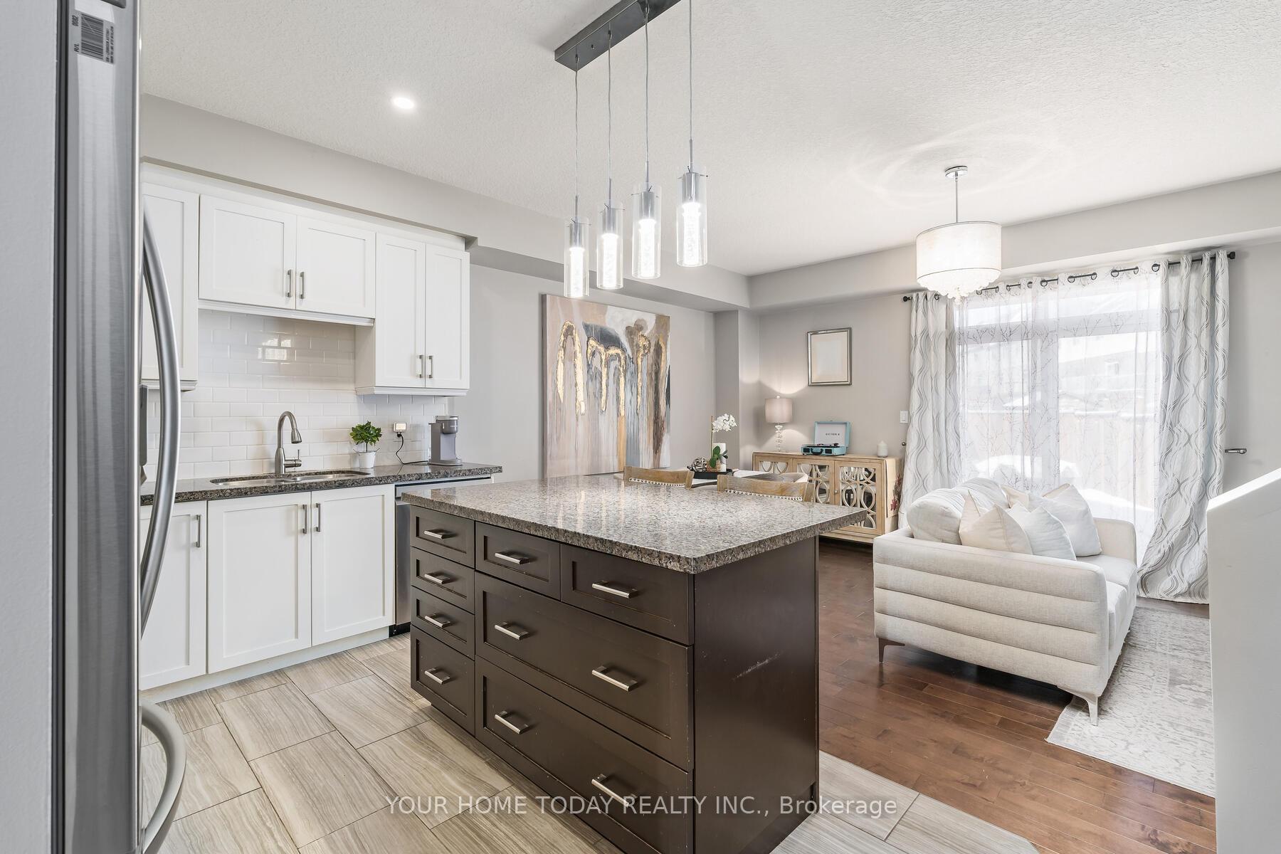 Situated in Guelph's highly desirable east end, this exceptional end unit townhome is set in a quiet family-oriented neighbourhood just minutes from schools, parks, library and picturesque trails. Enjoy the convenience of nearby amenities, the proximity of Guelph University and effortless access to major commuter routes. An inviting covered porch and professionally installed, all season, Gemstone lighting welcome you into the bright, open-concept main level where a thoughtfully designed floor plan makes everyday living and entertaining a delight. The living room showcases an eye-catching built-in wall unit with a toasty electric fireplace, open shelving and practical storage along with a convenient walkout to the yard. The adjoining dining area and kitchen add to the open vibe. The stunning kitchen serves as the heart of the home, showcasing beautiful two-tone cabinetry, a generous island with seating and sleek granite countertops - a perfect blend of style and functionality. A chic powder room completes this level. A lovely wood staircase leads to the upper level where the primary suite offers a walk-in closet and a beautifully finished 3-piece ensuite bath. Two additional bedrooms share a stylish 4-piece bathroom. The convenience of second-floor laundry with built-in cabinetry is a bonus. The finished lower level extends the living space with a cozy rec room featuring pot lights and laminate flooring while still providing ample storage and utility space. Rough-ins for a 3-piece bathroom and wet bar are a bonus! The fenced yard is almost maintenance free with large patio area (almost 90% of yard) providing the perfect outdoor entertaining space. Parking for three vehicles (one in garage, two in driveway) completes this impressive offering.