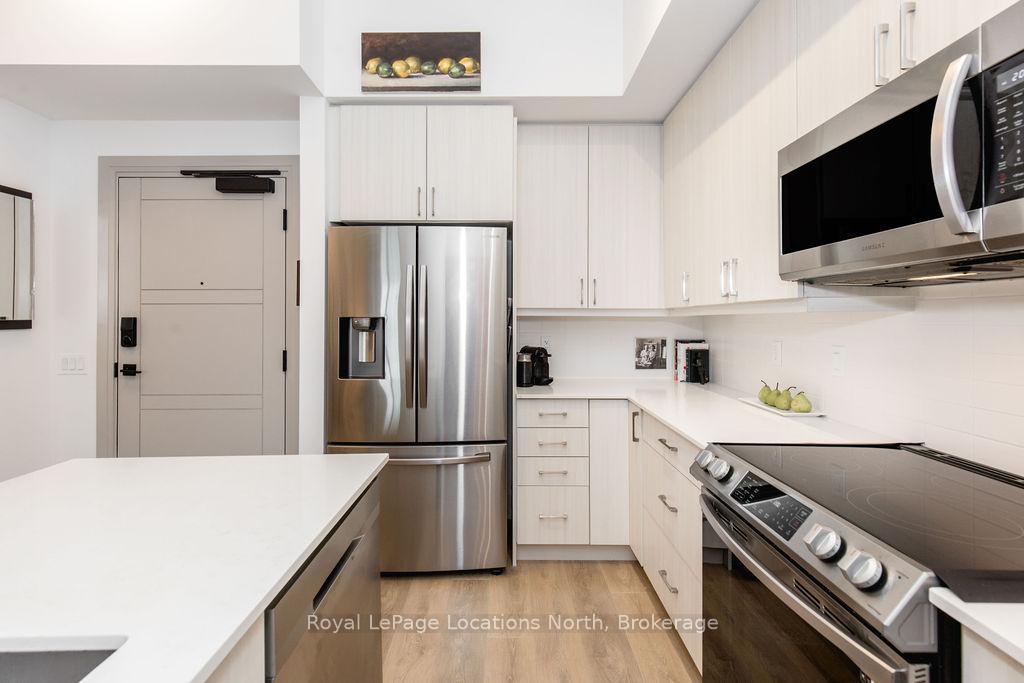 Luxury Downtown Living with EV Parking | Monaco Collingwood Live in the heart of downtown Collingwood in this beautifully upgraded 5th-floor suite at Monaco. This rare 2-bedroom, 3-bathroom layout features two private ensuites plus a guest powder room. With over $40,000 in upgrades and a premium parking space complete with an EV charger, this bright, open-concept unit is designed for modern living. Soaring 10-foot smooth ceilings, oversized windows, and neutral finishes create a light-filled, welcoming space. The kitchen is thoughtfully designed, featuring quartz countertops, extended cabinetry, a full pantry with pull-outs, two banks of pot drawers, stainless steel appliances, and a built-in microwave. Each bedroom offers its own private ensuite, while the additional powder room adds added functionality. Thoughtful details like pot lights with dimmers, laminate flooring throughout, and full-size front-loading laundry enhance the comfort of the home. Step out onto the open-air balcony to enjoy your morning coffee or unwind in the evening.Residents of Monaco enjoy exceptional amenities, including a rooftop fitness centre and terrace with BBQs, fire pit, waterfall, and dining areas. Additional features include a stylish lounge with kitchen, bicycle storage, visitor parking, Wi-Fi-enabled common areas, and a virtual concierge system with the One Valet app. Located just steps from the waterfront, restaurants, boutique shops, cafés, and everyday essentials, with Gordons Market, a Pilates studio, and Bone & Biscuit right in the building-this is true walkable lifestyle living in one of Collingwood's most desirable locations. Includes parking with EV charger and storage locker. Available immediately.